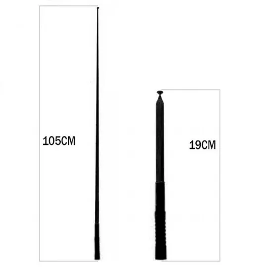 - Антенна с сложенном состоянии 6 дюймов (19 см), удлиняется до 42 дюймов (105 см) в длину и имеет гибкое основание.