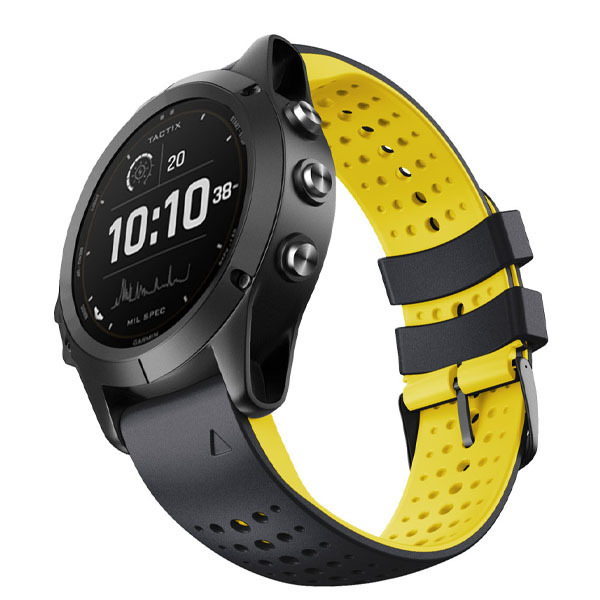 Ремешок дышащий Athlet 22 мм. для Garmin Fenix 7/6/5, EPIX 2, MARQ, Forerunner 935 / 945 / 955 / 965, instinct, instinct 2 двухцветный силиконовый быстросъемный (Черный/желтый)