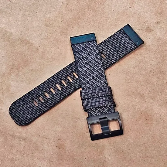 Ремешок 22 мм для Garmin (в стиле MARQ Gen 2), нейлоновый, жакардовое плетение, с системой быстрой замены QuickFit. Фурнитура выполены из сатиниpовaнной нержавеющей стали, винты из легированной стали.
