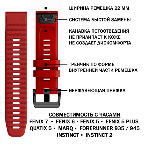 Ремешок силиконовый 22 мм. Premium для Fenix 7/6/5/5 plus, Quatix 5, MARQ, Forerunner 935 / 945 / 955 / 965, instinct, instinct 2 быстросъемный ( стиль Garmin Fenix 6 QuickFit) бордовый