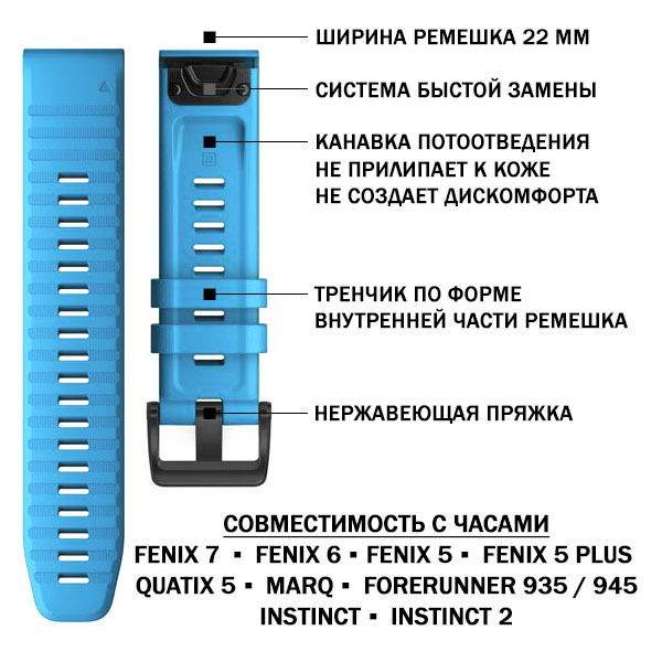 Ремешок силиконовый 22 мм. Premium для Fenix 7/6/5/5 plus, Quatix 5, MARQ, Forerunner 935 / 945 / 955 / 965, instinct, instinct 2 быстросъемный ( стиль Garmin Fenix 6 QuickFit) голубой