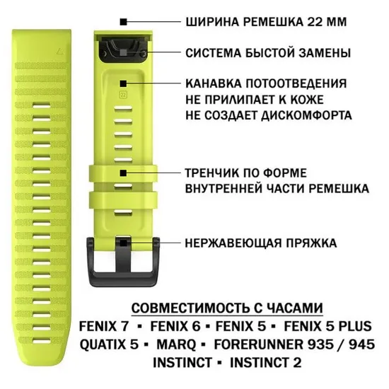 Ремешок силиконовый 22 мм. Premium для Fenix 7/6/5/5 plus, Quatix 5, MARQ, Forerunner 935 / 945 / 955 / 965, instinct, instinct 2 быстросъемный ( стиль Garmin Fenix 6 QuickFit) лайм