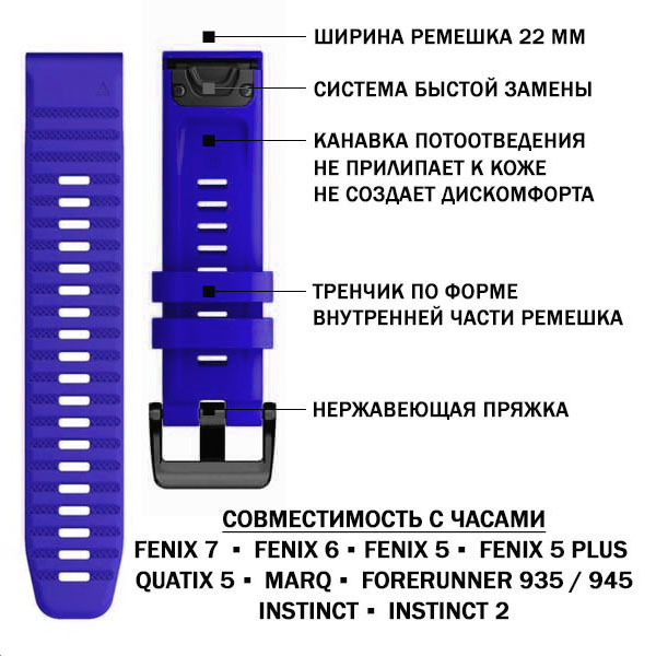 Ремешок силиконовый 22 мм. Premium для Fenix 7/6/5/5 plus, Quatix 5, MARQ, Forerunner 935 / 945 / 955 / 965, instinct, instinct 2 быстросъемный ( стиль Garmin Fenix 6 QuickFit) синий
