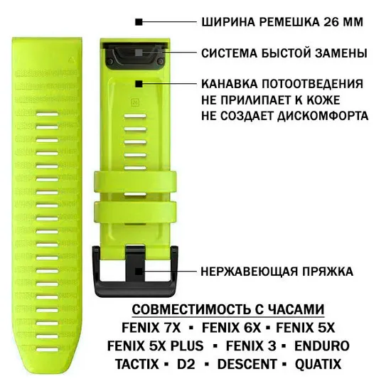 Ремешок силиконовый 26 мм. Premium для Garmin Fenix 7x/6x/5x/5x plus/3, Descent, Tactix, Enduro, D2, быстросъемный QuickFit (Лайм)