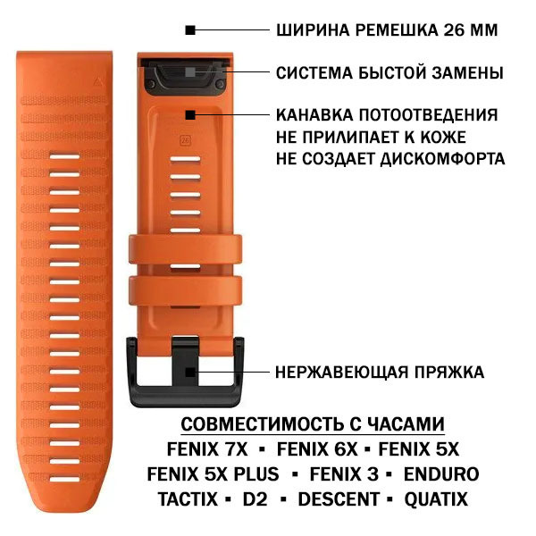 Сменный силиконовый ремешок 26мм с системой быстрой замены для часов Garmin, выполнен в стиле Garmin Fenix 6 и полностью идентичен фирменному. Изготовлен из высококачественного эластичного медицинского гипоаллергенного силикона.