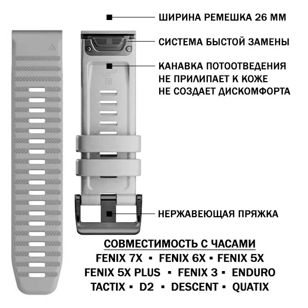 Сменный силиконовый ремешок 26мм с системой быстрой замены для часов Garmin, выполнен в стиле Garmin Fenix 6 и полностью идентичен фирменному. Изготовлен из высококачественного эластичного медицинского гипоаллергенного силикона.