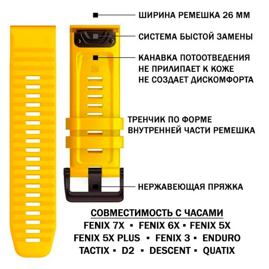 Сменный силиконовый ремешок 26мм с системой быстрой замены для часов Garmin, выполнен в стиле Garmin Fenix 6 и полностью идентичен фирменному. Изготовлен из высококачественного эластичного медицинского гипоаллергенного силикона.