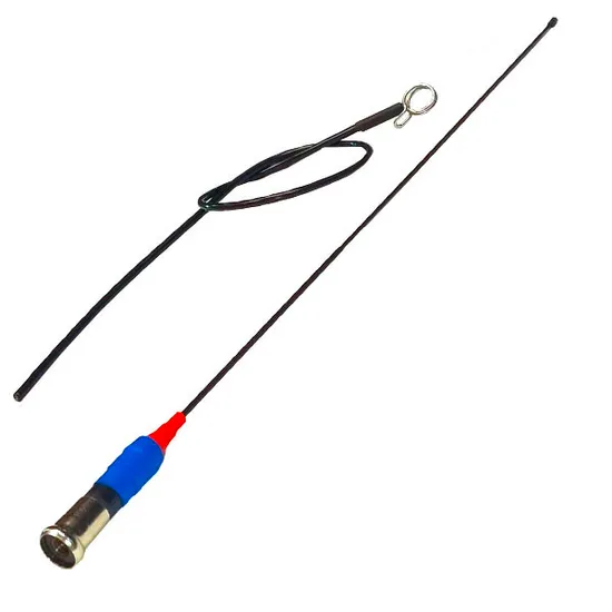 Антенна удлененная (36см + 47см ус), очень лёгкая и очень гибкая. Шпагу и ус можно спокойно сворачивать в кольцо, при этом длина уменьшается в 3 раза.